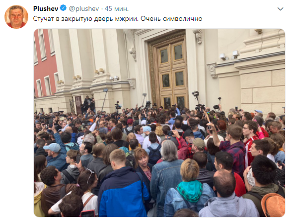 Яшин в конце акции призвал каждого ударить в дверь мэрии и сам подал пример. После этого люди по очереди начали подходить и, скандируя, стучать в дверь.
