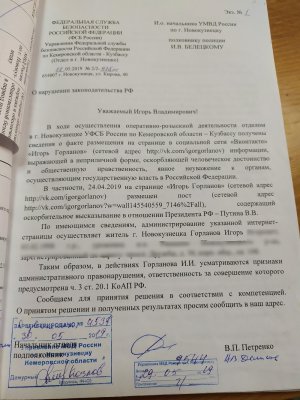 15 июля Горланов опубликовал на своей странице фото документов, из которых следует, что в результате оперативно-розыскной деятельности новокузнецкого отдела УФСБ России по Кемеровской области найдена информация, выражающая «в неприличной форме, оскорбляющей человеческое достоинство и общественную нравственность, явное неуважение к органам, осуществляющим государственную власть в Российской Федерации».