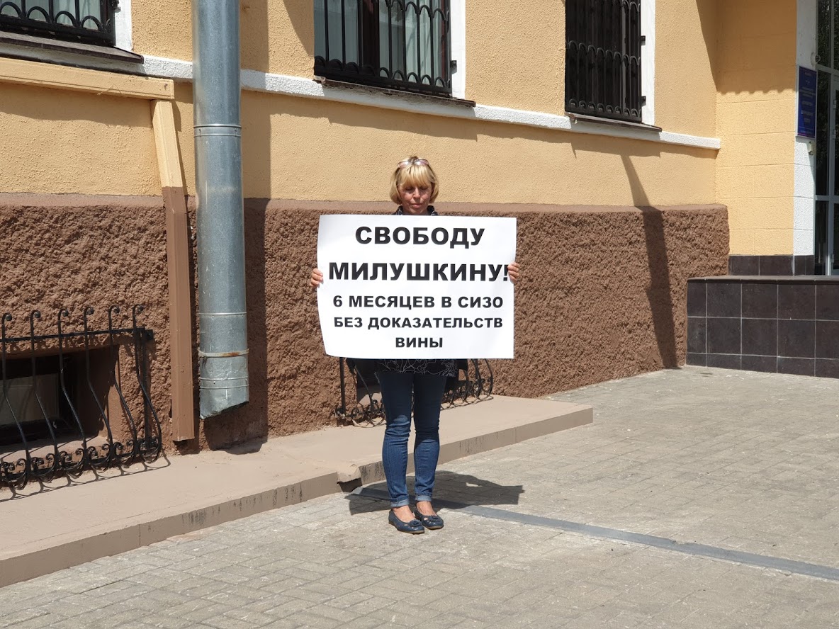 15 июня активисты и правозащитники Пскова, устав ждать от следствия реальных доказательств вины Милушкиных, объявили о начале бессрочной акции в поддержку арестованных супругов. Они ежедневно стоят в одиночных пикетах и обещают уйти только в случае, если Милушкиных освободят или предъявят им доказательства их вины. «Пикеты – часть общественной кампании, цель которой – не дать полиции сделать всё как они привыкли – без лишнего внимания прессы и общества. Сделать то же самое под камерами журналистов и правозащитников значительно сложнее, – объясняет активный участник пикетов псковский правозащитник Владимир Жилинский. – И теперь следствие, понимая, что «как обычно» уже не получится, а имеющиеся доказательства в суде будут просто подняты на смех, начало искать что-то другое.