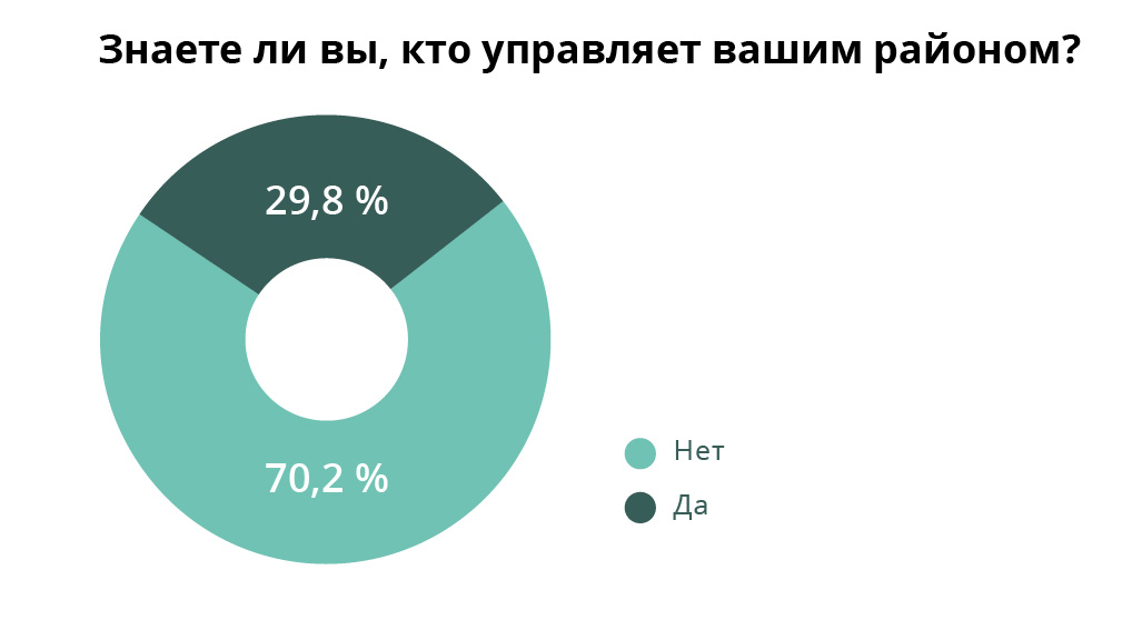 Чтобы измерить вовлеченность горожан в политическую жизнь своего района, отдел исследований задал вопрос «Знаете ли вы, кто управляет вашим районом?» Только 30 % всех респондентов ответили утвердительно. Чаще районную администрацию знают жители Приморского, Петроградского, Московского и Кировского районов. В этот список не попали центральные районы — Адмиралтейский и Центральный.