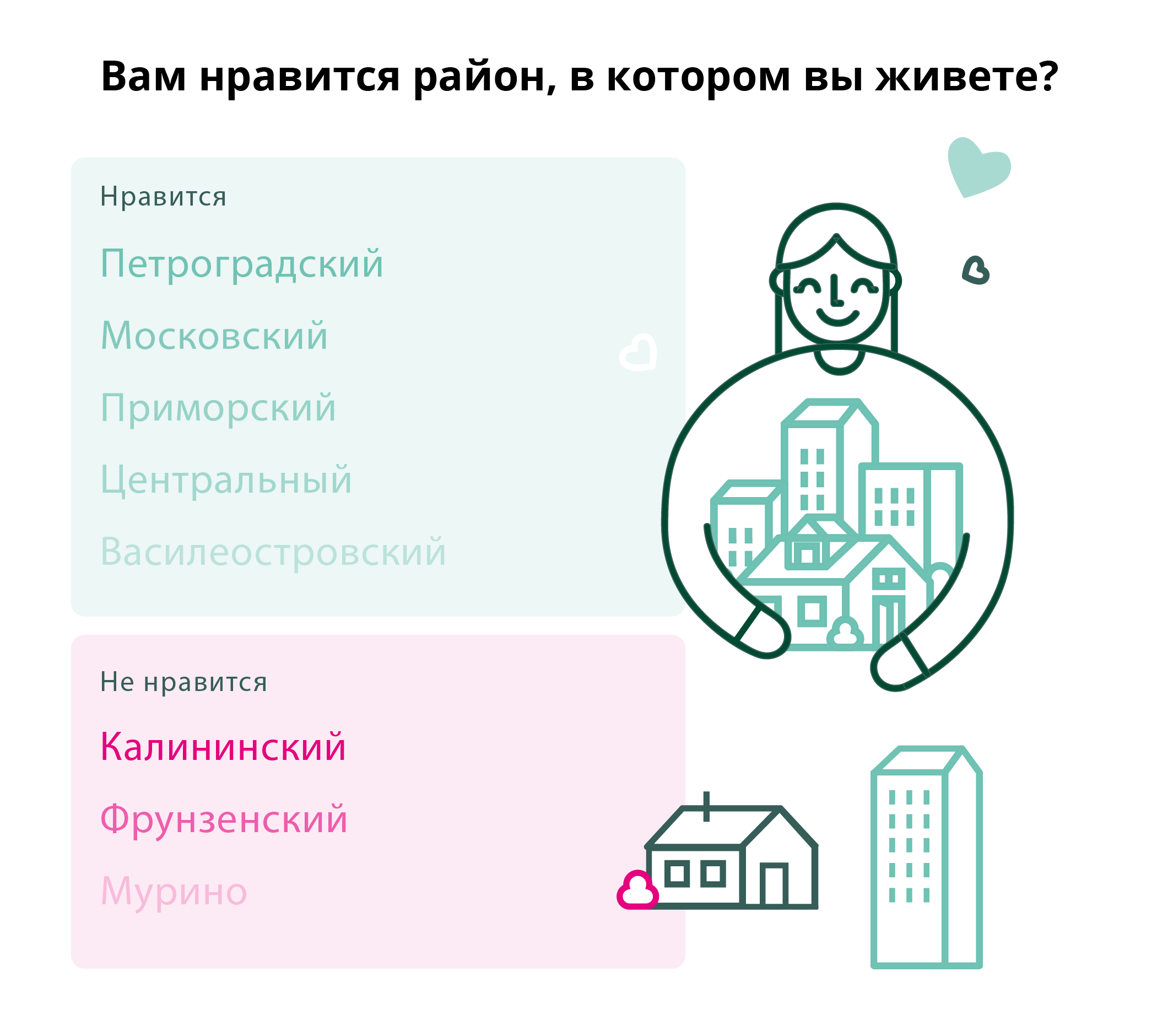 Как горожане относятся к разным районам Петербурга, готовы ли проводить там свое свободное время и на что обращают внимание при переезде — на наличие парков и магазинов или на транспорт и безопасность?