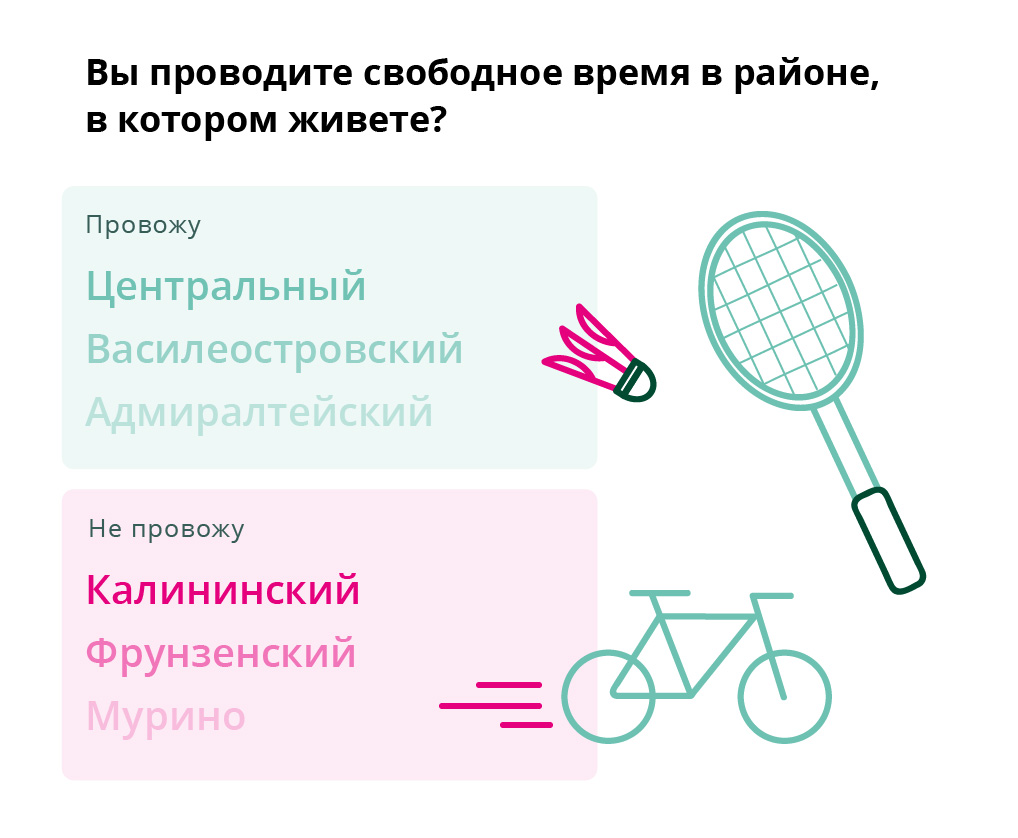 Читатели «Бумаги» рассказали, проводят ли они свободное от работы и учебы время в том районе, где живут. Больше половины участников опроса — 66,3 % — проводят там большую часть времени; 29 % находятся там малое количество времени, а 4,6 % не проводят там досуг вообще. Ответы показывают, насколько инфраструктура района удовлетворяет опрошенных горожан. При этом требования жителей разных районов могут отличаться, что связано с разницей в доходе, возрастом и так далее.