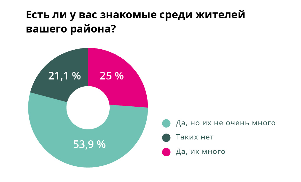 Отдел исследований «Бумаги» хотел выяснить, чувствуют ли горожане принадлежность к своему району и поддерживают ли связь с другими его жителями. Активно общается с соседями только четверть респондентов. Еще 21 % отметили, что у них вообще нет знакомых среди жителей района.