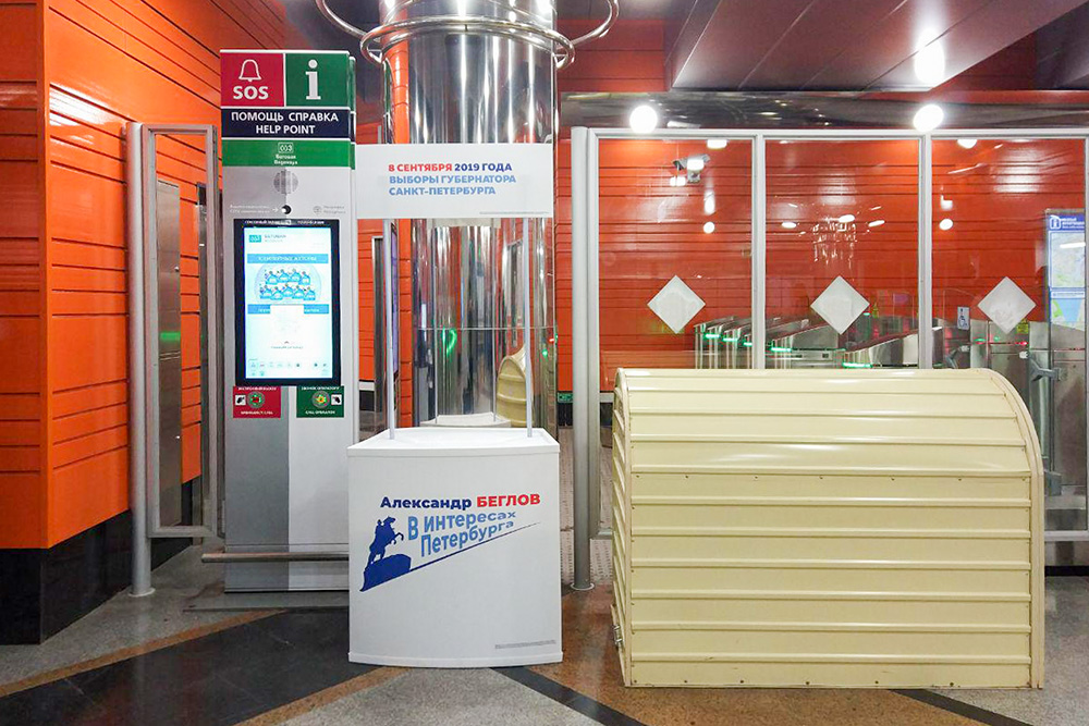 С началом официальной кампании врио в метро появились стойки, за которыми люди в футболках с надписью «Александр Беглов» собирали подписи в его поддержку. При этом в правилах пользования метрополитеном говорилось, что на его территории запрещена любая агитация. Несмотря на это, спустя месяц всем кандидатам разрешили собирать подписи в метро — однако никто кроме Беглова не стал этого делать.