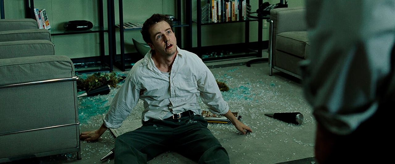 Когда Дэвид Финчер принимается за книгу Чака Паланика «Бойцовский клуб», то хохочет без остановки. Он ставит крупнобюджетную комедию — его фильм высмеивает не только консьюмеризм и «подавленную» маскулинность, но и саму реакцию мужчин, их скудные сценарии противодействия. Однако он не хочет раскрывать все карты. На площадке режиссёр то и дело ругается с Эдвардом Нортоном, который играет героя-рассказчика. Нортон считает, что зрителю нужно заговорщицки кивать, а Финчер не желает играть в поддавки.