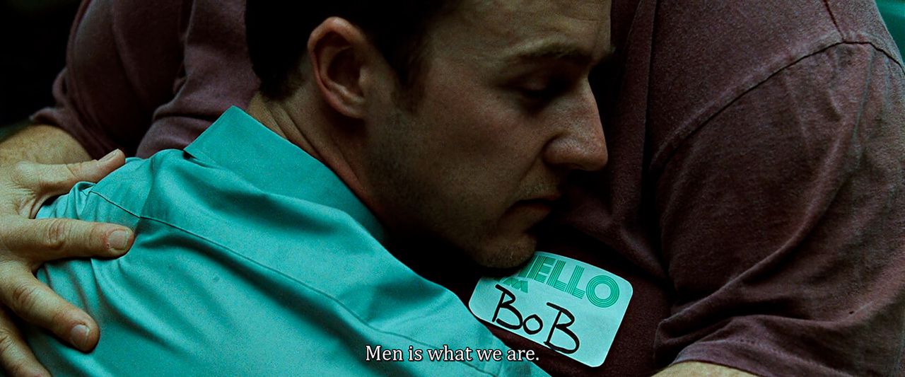 «Бойцовский клуб» не только обнажает банкротство классической маскулинности, когда мужчина по половому признаку чувствовал себя хозяином положения, но и высмеивает возможные пути её «оживления». Сам фильм снят как будто бы галопом: рваный монтаж, калейдоскопическая перемена локаций, взвинченный темп действия — словно второпях кормит податливого зрителя с ложки. То есть доминирует над смотрящим. В этой интонации нет ничего «братского». Моменты мужского братания здесь порой завершаются не восклицанием, а неоднозначным умолчанием.