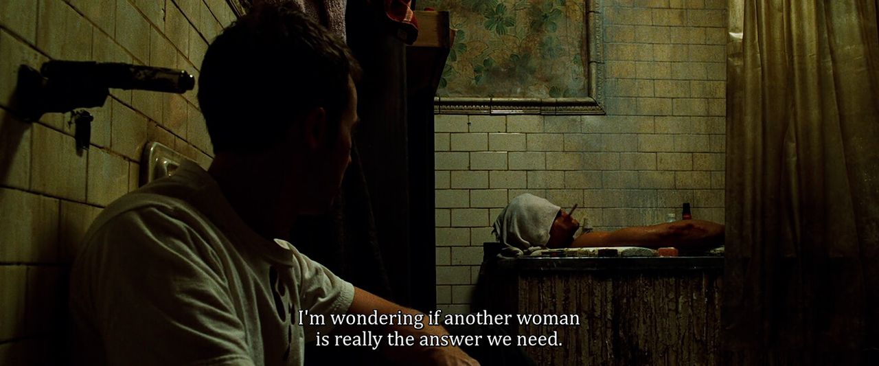 В одной из сцен рассказчик на унитазе и Тайлер Дёрден в ванне делятся историями про своих отцов. Сначала всё знакомо: оба росли с матерями, отцы не служили им примером. Затем происходит комическое срастание с проблемой потребительства: об отце, который каждые шесть лет менял семью, Дёрден говорит: «Ублюдок просто создавал франшизы». Наконец, разговор приводит к неожиданному завершению: Дёрден не верит, что «женщина — тот ответ, что нам поможет». Действительно, от знакомства с загадочной Марлой Сингер у героя одни неприятности. В ванной комнате повисает пауза, прерванная лишь монтажным стыком. В конце концов, а была ли на самом деле Марла? Или, как и Тайлер, она ― плод воображения героя?