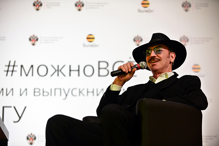 Интервью Михаила Боярского состоялось в день матча «Зенита», игры которого артист посещает регулярно. Тем не менее он пришел в СПбГУ и долго говорил с ведущим и гостями.