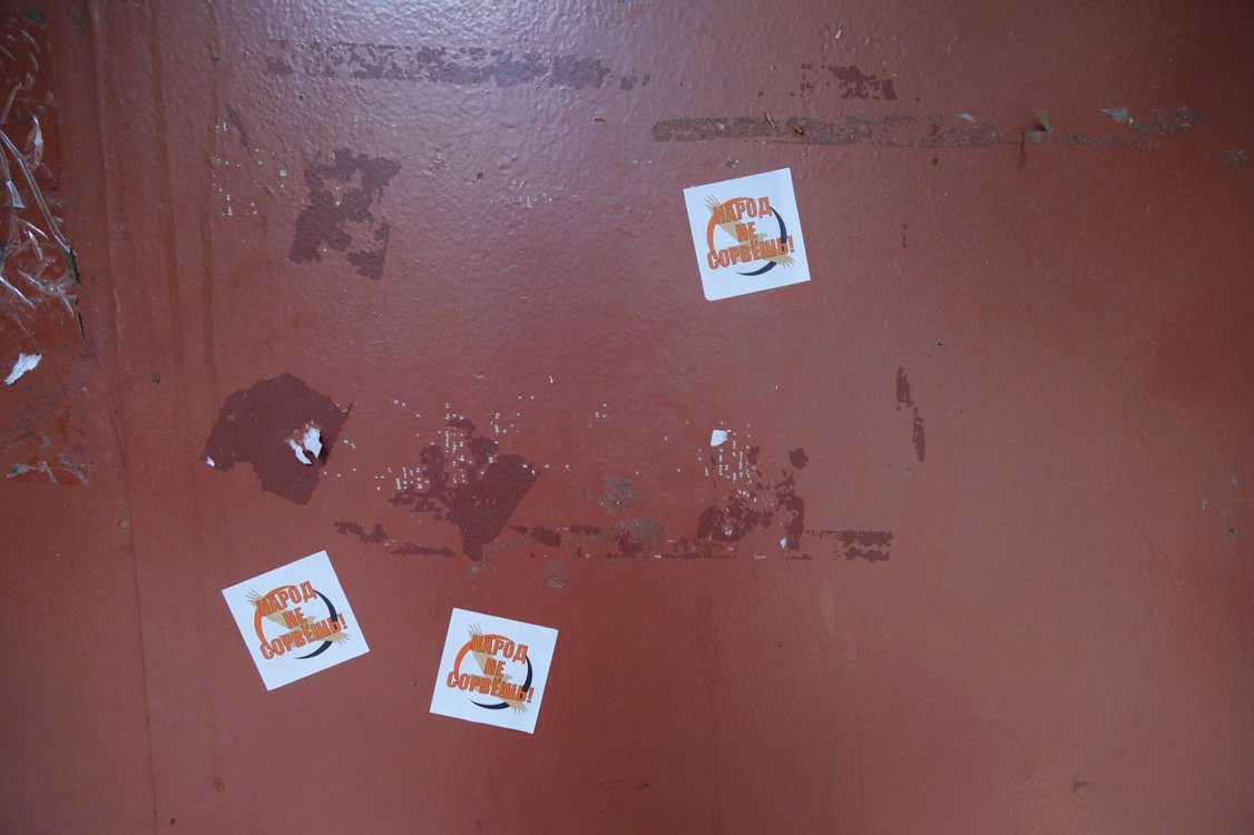 Под плакатами активисты повесили стикеры с текстом «Народ не сорвешь». Акцию провели из-за нарушений, с которыми столкнулись кандидаты в муниципальные депутаты в Петербурге.