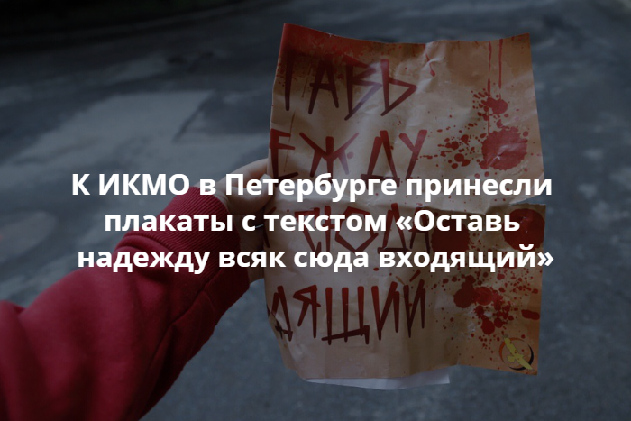 Активисты Либертарианской партии 20 июля принесли к ИКМО плакаты с надписью «Оставь надежду всяк сюда входящий» и разместили у входа. Об этом «Бумаге» сообщили участники движения.