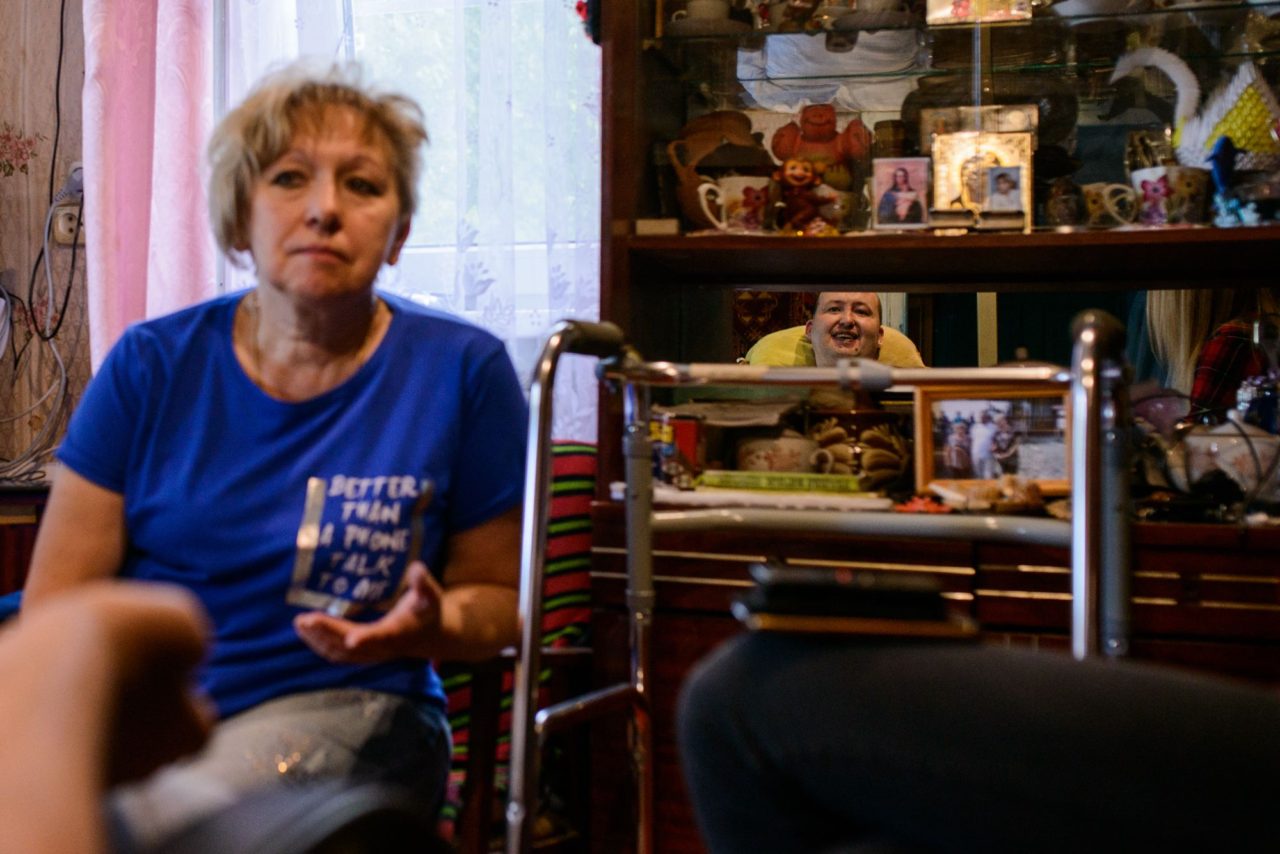 Алексей не может разборчиво говорить, Елена помогает ему общаться с другимиФото: Кристина Бражникова для ТД «Иногда и вечерами сидит за работой. Я ему говорю: “Ну Леш, ну полставки же”. А он в ответ: “Замолчи. Мне это нужно”.