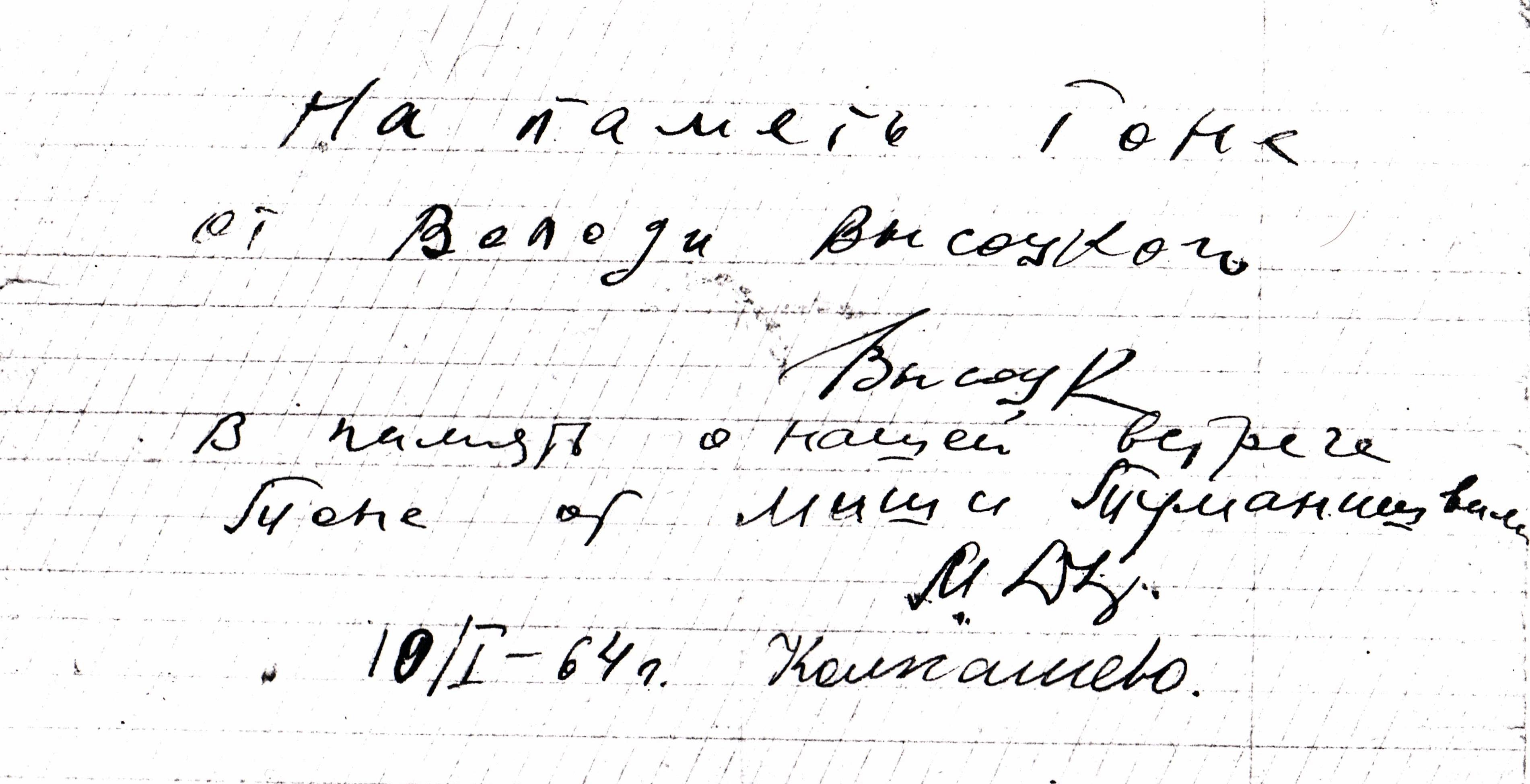 Автографы В.Высоцкого и М.Туманишвили жительнице г. Колпашева А.П. Пикаловой. 1964 г.