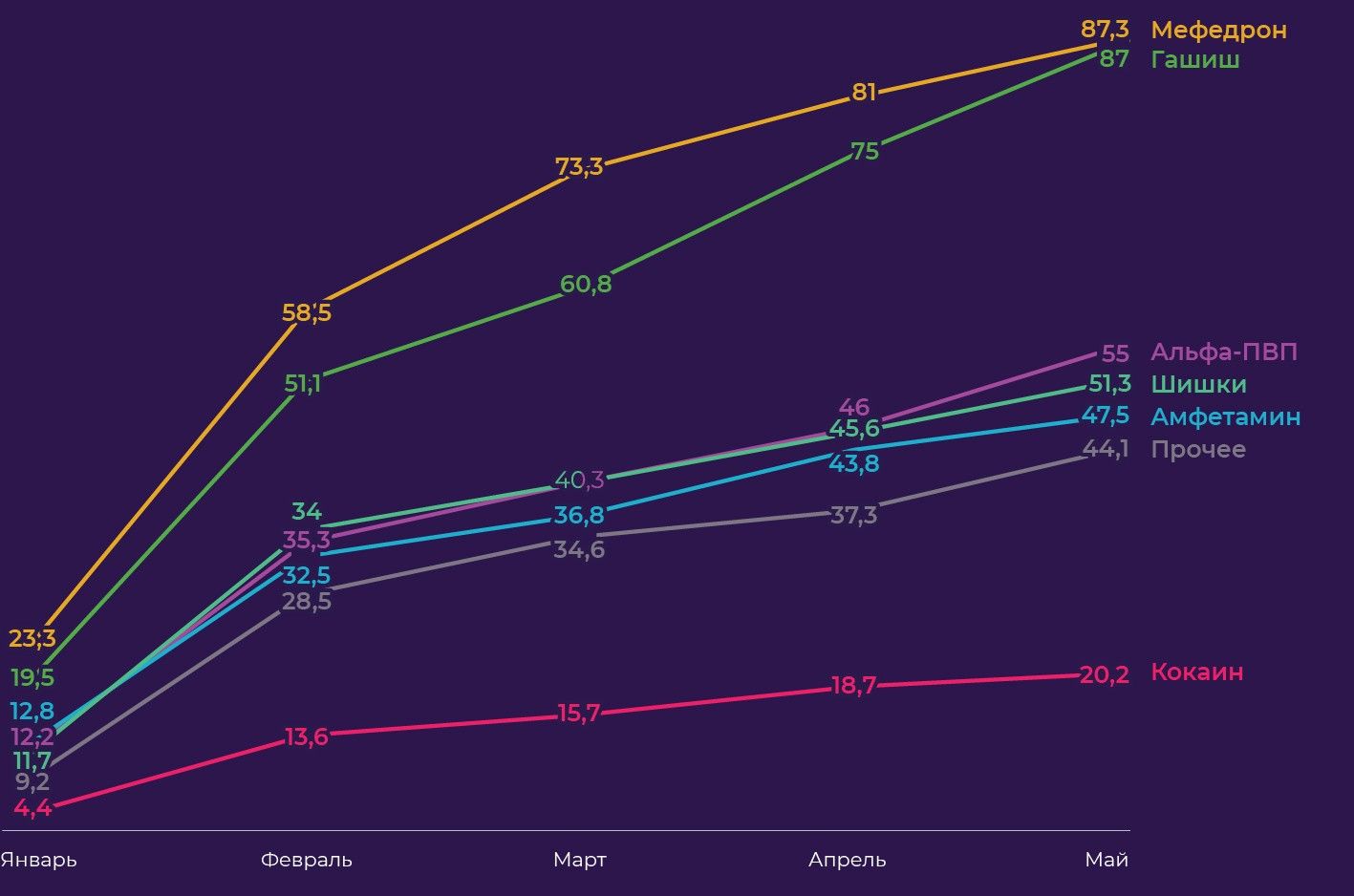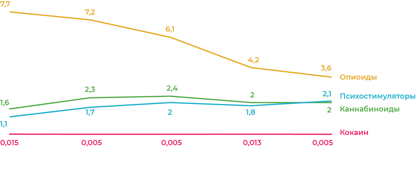 Во всех городах виден тренд на увеличение доли новых синтетических наркотиков — мефедрона и альфа-ПВП. Рост их популярности связан с тем, что синтез этих наркотиков довольно прост, а его цена — низкая.