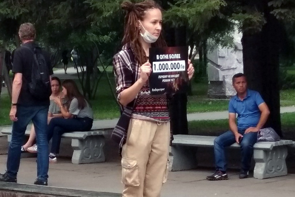 Девушка вышла в противопылевой маске и с плакатом. на котором было написано: «В огне более 1000000 га. Почему не вводят режим ЧС?»