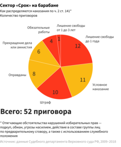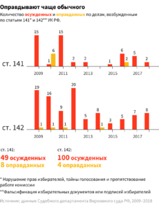 - Статистика. Статья 141 УК РФ применяется нечасто и потому называется «спящей». Согласно данным судебного департамента Верховного суда России, с 2009 года по ней осудили 49 человек, 8 человек были оправданы, еще пять дел было прекращено. Для потенциальных обвиняемых это неплохие шансы — 13% оправдательных приговоров. Для сравнения, по статье 142 УК РФ (фальсификация избирательных документов), также связанной с выборами, за то же время осудили 182 человека. При этом оправдали только четверых — это чуть больше 2% вынесенных судом решений.