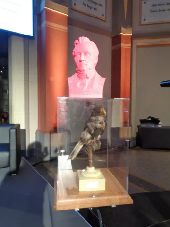 Humboldt-Feier благоразумно начался в 19:30, когда необычная для июня жара спа́ла. Многие (и мы) пришли заранее. Праздник проходил прямо в главном зале музея рядом со знаменитыми гигантскими динозаврами. Перед подиумом была установлена голова А. Гумбольдта, красного цвета, подставкой для которой послужила стеклянная коробка с чучелом любимого попугая, привезенного путешественником из Южной Америки (рис. 6).