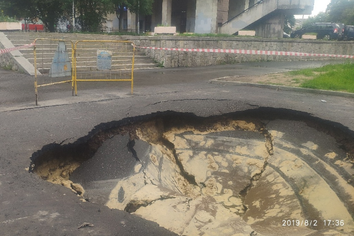 На дороге у площади Мужества провалился асфальт. Там образовалась яма размером с автомобиль