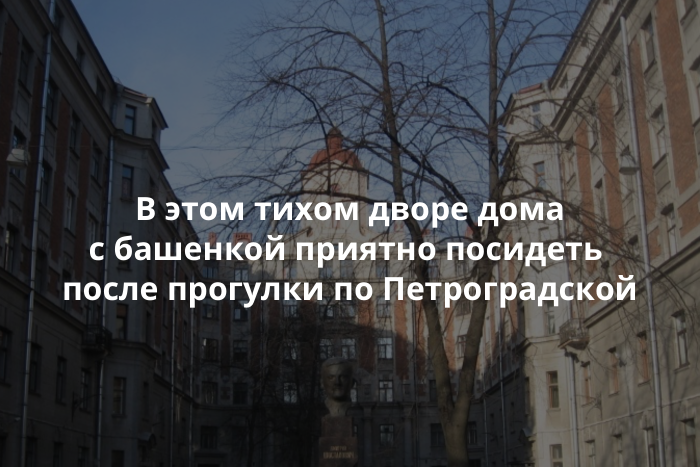 Хочу рассказать о любимом месте на Петроградке, а именно дворе-курдонере (открытом парадном дворе — прим. «Бумаги») дома с башенкой на пересечении Кронверкской улицы и Большой Пушкарской. Там уютно и приятно, я любил туда заходить, когда учился в универе неподалеку.