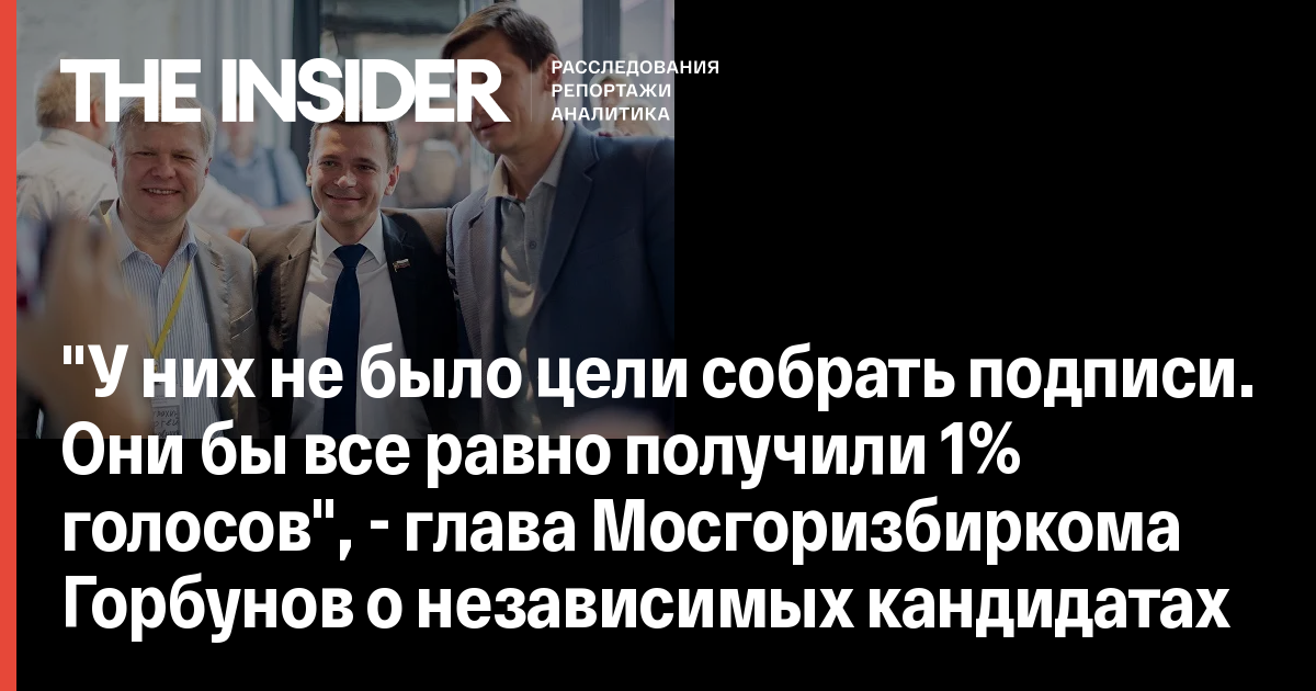 Глава московской избирательной комиссии Валентин Горбунов заявил, что у независимых кандидатов в Мосгордуму не было цели участвовать в выборах, а они «используют их как способ обкатки технологий» к выборам в Госдуму в 2021 году и проводят «своеобразную репетицию борьбы за отмену сбора подписей». Его слова приводит «Российская газета».