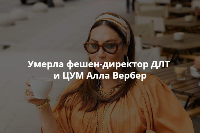 Умерла фешен-директор ДЛТ и ЦУМ Алла Вербер. Об этом сообщают СМИ и бывший главный редактор журнала Vogue Алена Долецкая. Эту информацию изданию Hello подтвердили в пресс-службе ЦУМ.