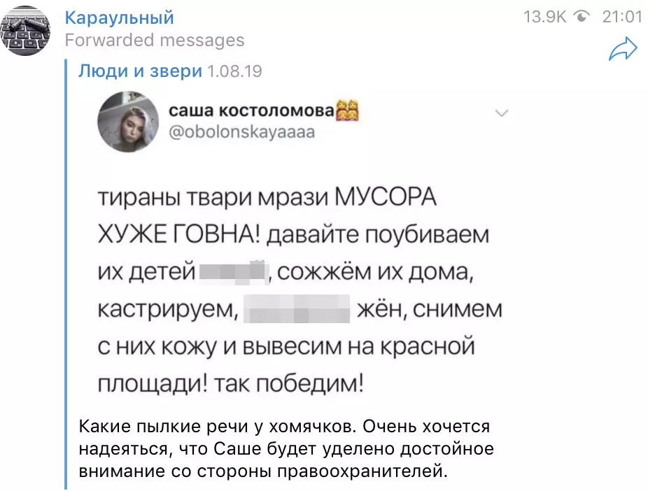 «тираны твари мрази МУСОРА ХУЖЕ ГОВНА! давайте поубиваем их детей ***, сожжем их дома, кастрируем, *** жен, снимем с них кожу и вывесим на красной площади! так победим!», — написала Саша. и добавила реплаем: «Ну и чем вы лучше?». Но первое сообщение уже ретвитнула Мария Мотузная, и часть ее «хейтеров» восприняла все серьезно.