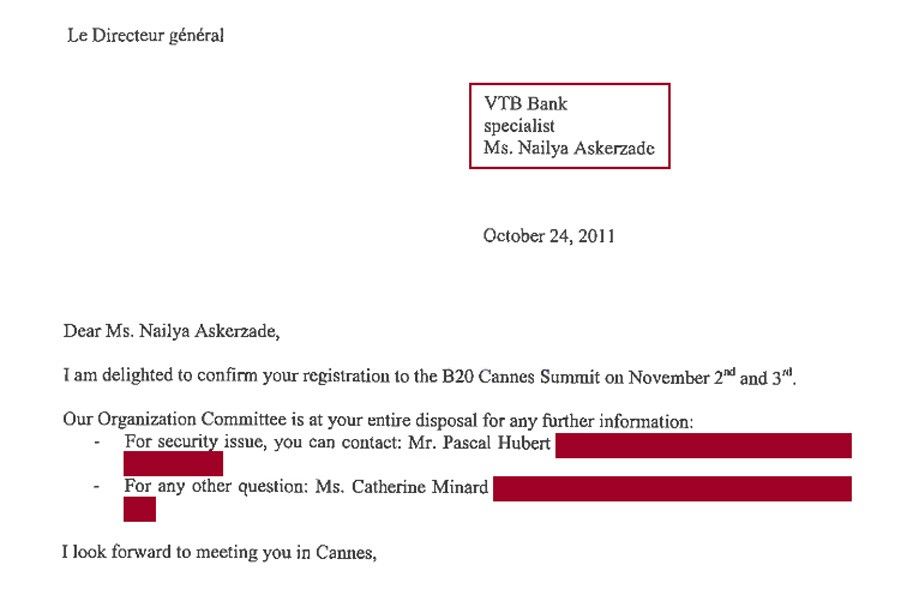 Сестра Аскер-заде Инара тоже крепко связана с ВТБ. Хотя «Проекту» Аскер-заде и сказала, что «ее сестра работает мамой», Инара Аскер-заде числится в списке сотрудников банка ВТБ в должности менеджера global banking , рассказал собеседник «Проекта» в ВТБ, пресс-служба банка это не прокомментировала. В списке участников Международного инвестиционного форума в Сочи , есть в распоряжении «Проекта», в 2015 году есть обе сестры Аскер-заде — и обе указаны как «помощницы президента-председателя правления банка ВТБ», то есть Костина. Также в распоряжении «Проекта» есть адресованное Аскер-заде письмо от директора «Движения предприятий Франции» Мишеля Гульбо, подтверждающее ее регистрацию на форуме «Деловой двадцатки» в Каннах в конце октября 2011 года. И там Аскер-заде зарегистрировалась как «специалист ВТБ» (*!. Документ доступен в архиве хакерских утечек, опубликованных OCCRP). В то время Наиля уже работала на ВГТРК. Сама Наиля заявила «Проекту», что никогда не работала в ВТБ, а собеседник, знакомый с Костиным предположил, что журналистка не принимает участия в работе банка, но числится в списке сотрудников «по личным причинам» — чтобы иметь возможность путешествовать со своим спутником жизни.