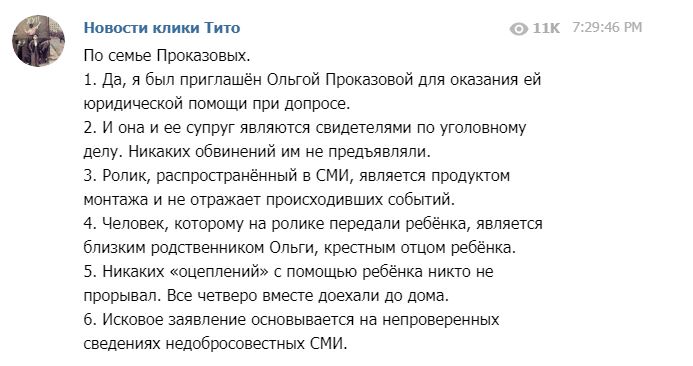 Накануне Дмитрия Проказова и его супругу Ольгу более 3 часов допрашивали в Следственном комитете. Как сообщил по итогам допроса адвокат Дмитрия Проказова Максим Пашков, у следствия "нет претензий" к Дмитрию и Ольге. Об этом же Пашков позже написал в своём телеграме: