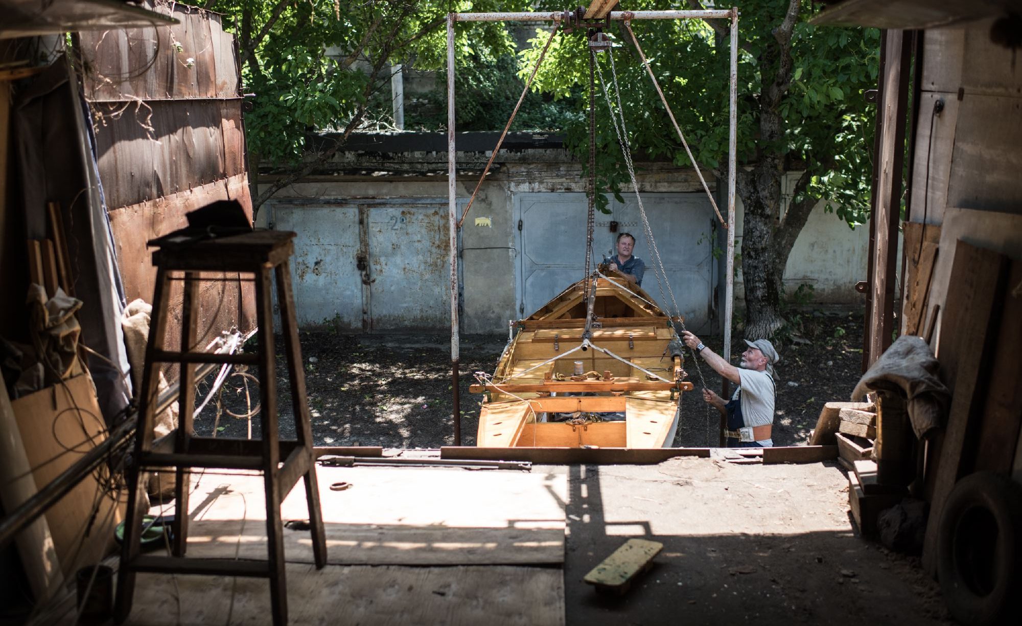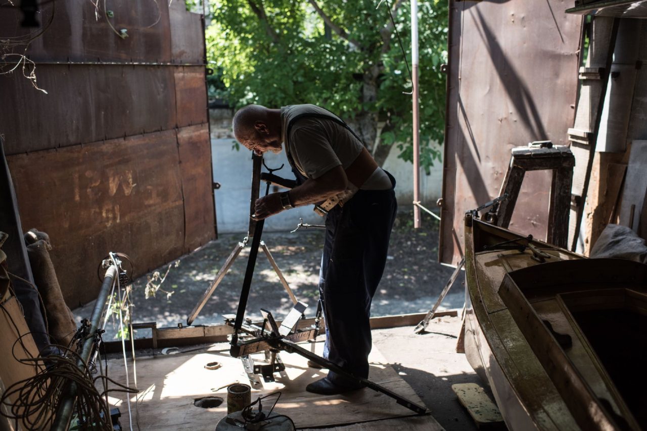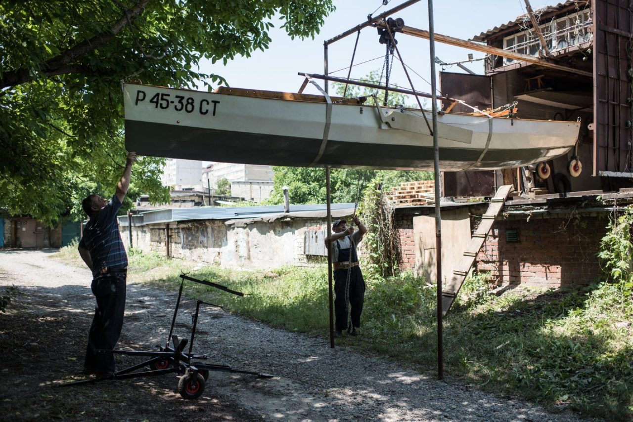 Валентин Борисович руководит мной, пока я карабкаюсь вверх по металлической лестнице. Не очень сложно, но и простой такую забаву не назовешь. А он проделывает этот трюк каждый день по несколько раз. Внутри эллинга — рабочий беспорядок, семиметровый корпус яхты и страшная жара. «Как на подводной лодке в седьмом отсеке», — шутит кораблестроитель, смахивая пот.
