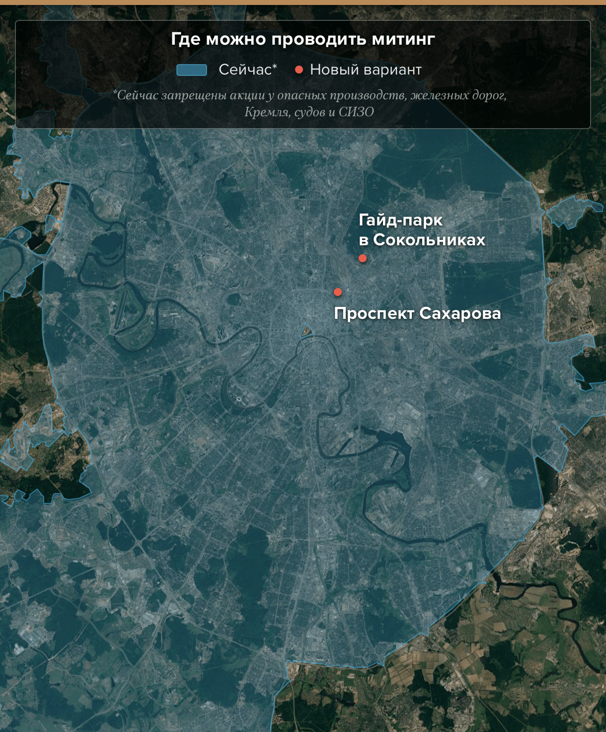 Картографические данные: Image © 2019 Maxar Technologies, Image Landsat / Copernicus, Image © 2019 CNES / Airbus 9 августа в Совете Федерации и Госдуме объявили, что надо рассмотреть вопрос об ограничении перечня мест, в которых можно проводить массовые акции. Предполагается, что митинговать с согласования властей можно будет не на любой площадке (сейчас есть лишь небольшой перечень ограничений), а только в специальном месте, определенном заранее. Например, в Москве таким местом предложено выбрать проспект Академика Сахарова. Фото в анонсе: Михаил Терещенко / ТАСС / Scanpix / LETA