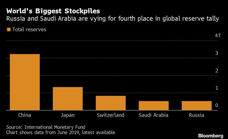 В этом году Россия впервые за восемь лет может выйти на четвертое место в мире по объему золотовалютных резервов после Китая, Японии и Швейцарии, прогнозирует Bloomberg. Сейчас Россия пропускает вперед и Саудовскую Аравию, но в отличие от нее — активно наращивает, а не расходует резервы.