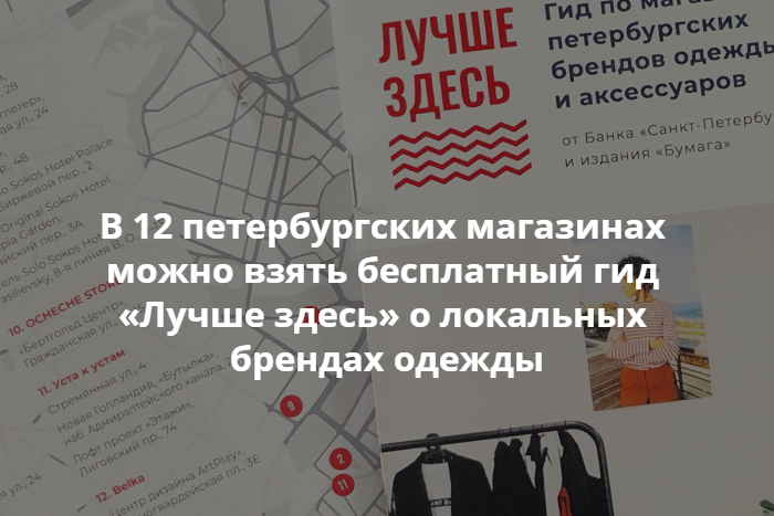 Банк «Санкт-Петербург» и «Бумага» выпустили печатную версию гида «Лучше здесь». Взять буклет можно в каждом из магазинов-участников проекта: всего в него вошло 12 марок.
