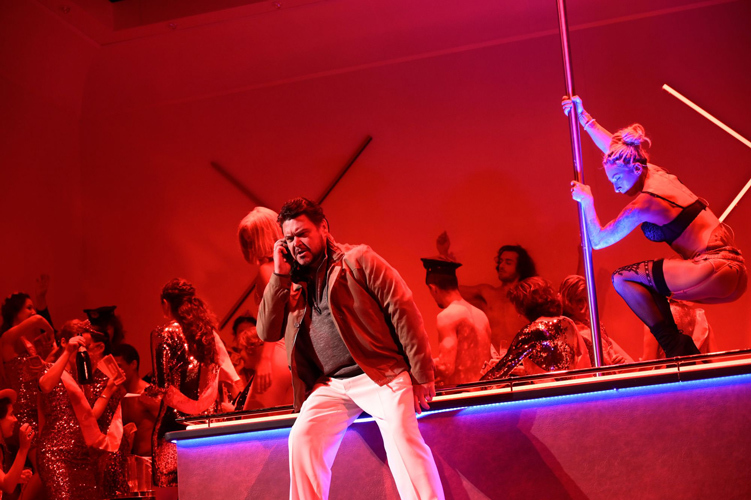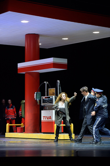 © Salzburger Festspiele / Thomas Aurin Современность в спектакле присутствует не только на экране, но и на сцене — мальчишник проходит в стрип-клубе, Медея звонит Ясону из интернет-кафе, по степени знаковости с танцами вокруг шеста соперничают селфи в салоне для новобрачных. А главное — автомобиль. Словно чеховское ружье, которое долго висит, прежде чем выстрелить, он появляется сначала на экране, чтобы материализоваться в финале, рвануть в прямом смысле слова: на сцене возникает настоящая бензоколонка, Медея запирает детей в машину и садится туда сама, изнутри салон наполняется дымом, сверкает огонь. У Корнеля, чья пьеса легла в основу либретто, горит храм; ну вот она — поправка на время, вот он — храм наших дней.