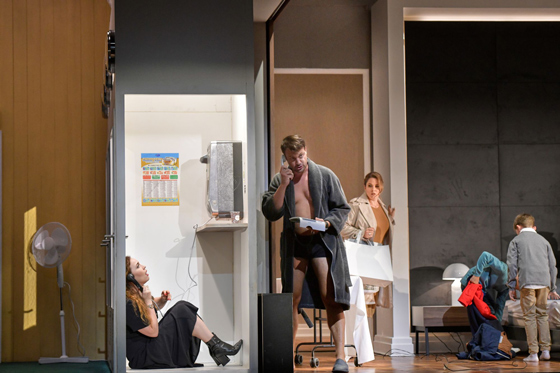 Оформлявший спектакль австралийский художник Боб Кузен легко подчинил себе необъятное пространство сцены Фестшпильхауса: ощущение такое, что он всю жизнь только с ним и работает. Он то делит его на несколько секторов, которые населяются одновременно, то разворачивает действие во всю ширь, то закрывает большую часть сцены, а то выстраивает второй этаж — на нем разыгрывается сцена в венском аэропорту между Медеей и пытающимся запретить ей въезд в страну Креонтом (российский бас Виталий Ковалев). Телевидение ведет оттуда прямой репортаж, и на нижнем уровне, в квартире с большим телевизором, его смотрит Нерис (российская меццо-сопрано Алиса Колосова): именно в этот момент она принимает решение во всем помогать своей лучшей подруге Медее.