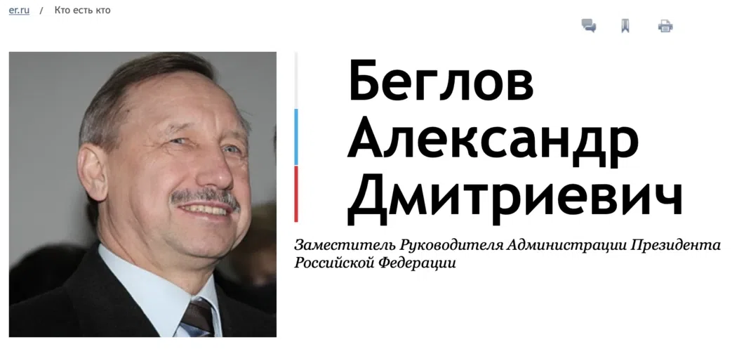 При попытке зайти на биографию Беглова на сайте ЕР появляется «Ошибка 404», однако в кэше сохранились копии страницы с биографией Беглова, а поисковики Google и «Яндекс» выдают ссылки с фотографией чиновника и предпросмотром сведений о нем. До удаления на странице содержалась краткая биография Беглова, где он упоминался как член высшего совета партии и бывший глава ее петербургского отделения