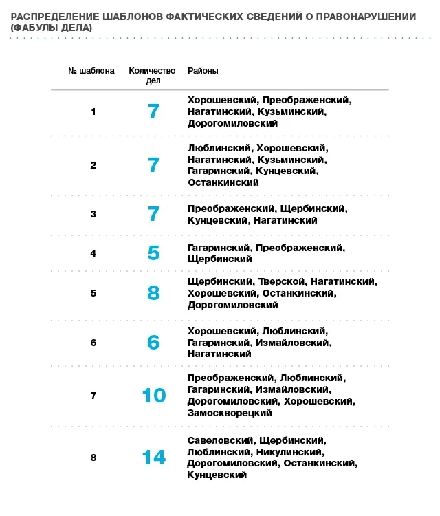 В результате удалось выявить 8 шаблонов фактических сведений о правонарушении (фабулы дела), которые использовались в 64 делах в судах районов: Гагаринского, Дорогомиловского, Замоскворецкого, Измайловского, Кузьминского, Кунцевского, Люблинского, Нагатинского, Никулинского, Останкинского, Преображенского, Савеловского, Тверского, Хорошевского, Щербинского.