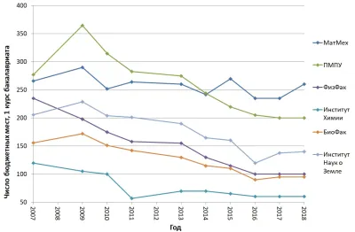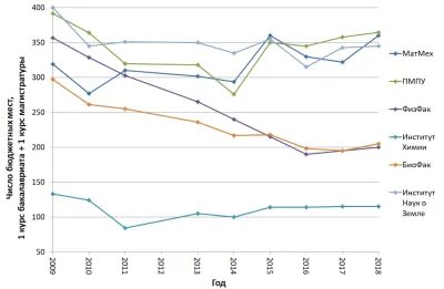 И проблема даже не в том, что администрация стремится к заветному соотношению «12 студентов на одного преподавателя», установленному правительством, а в том, как она это делает. Сейчас средний по СПбГУ показатель составляет 6,5 студента на одного преподавателя. Об увеличении числителя даже речи не идет — за последние десять лет прием на первый курс физфака непрерывно сокращался: в 2007 году выделялось 235 мест, сейчас 100. Проходной балл ЕГЭ при этом, конечно, вырос, место СПбГУ в соответствующих рейтингах поднялось, но стоил ли результат таких жертв? Это общая тенденция для всех естественнонаучных факультетов: снижается число мест в бакалавриате, но повышается — в магистратуре. Однако прием в магистратуру того же физфака не вырос, а упал в 1,6 раза в сравнении с 2009 годом; на биофаке снижение составило порядка 10%. Бакалаврам из других вузов тяжело приспособиться к местной магистратуре, ведь обучение на кафедре («блоке дисциплин») начинается уже на третьем курсе. В целом нынешний СПбГУ выделяет порядка 2000 бюджетных мест для поступающих на первый курс, уступая Политеху с 2700 мест и приближаясь к ЛЭТИ (1800), Горному университету и ИТМО (по 1500).