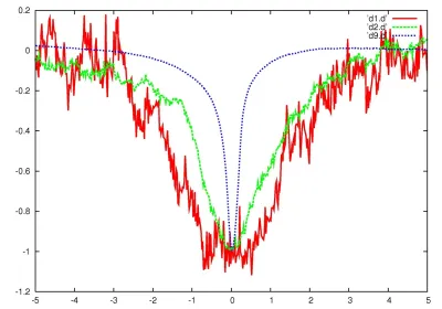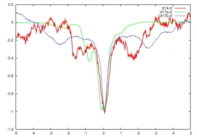 На рис. 3 показаны несколько типичных провалов, приведенных к одному времени и амплитуде. У всех примерно одинаковая форма, несмотря но то что их глубина отличается в тысячу раз. Эта форма никак не соответствует типичной кривой транзитов планет по диску звезды — они имеют U-образную форму, эти провалы — V-образные. Между тем наиболее часто упоминаемая гипотеза связывает провалы блеска Табби с транзитами чего-то по ее диску. Назывались облака пыли, рои комет и даже элементы конструкции сферы Дайсона. В принципе, с помощью облака, сравнимого по размерам со звездой, можно натянуть эту V-образную форму, но чтобы такую стандартную при столь разной амплитуде — это надо очень сильно напрягаться (симуляции кривой блеска с помощью пролетающих на фоне звезды объектов проводятся, но разумного объяснения, откуда берутся такие объекты, не существует). Синяя и красная кривые на рис. 3 в одной из статей интерпретируются как нечто с кольцами, пролетевшее на фоне звезды. Хотя это нелегко совместить с V-образной формой провала.