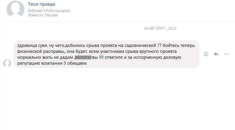 По его словам, 14 августа с пустых аккаунтов в Facebook ему начали писать сообщения, в которых говорилось, что всем, кто участвовал в пресечении работ по сносу зданий на Садовнической, больше «не жить нормально в Москве» и им за это придется ответить. Все это сопровождалось нецензурной лексикой, добавил Новичков.