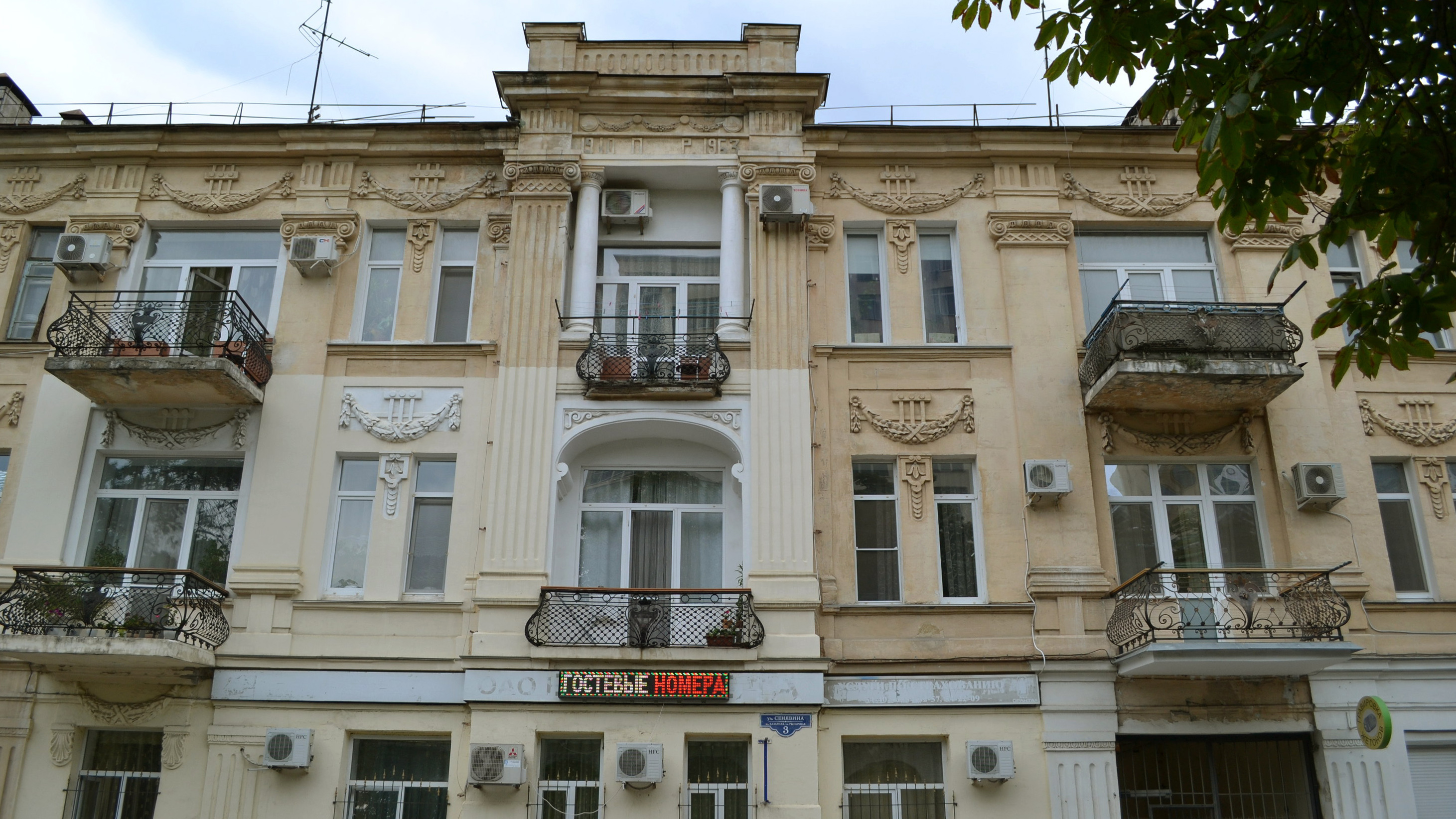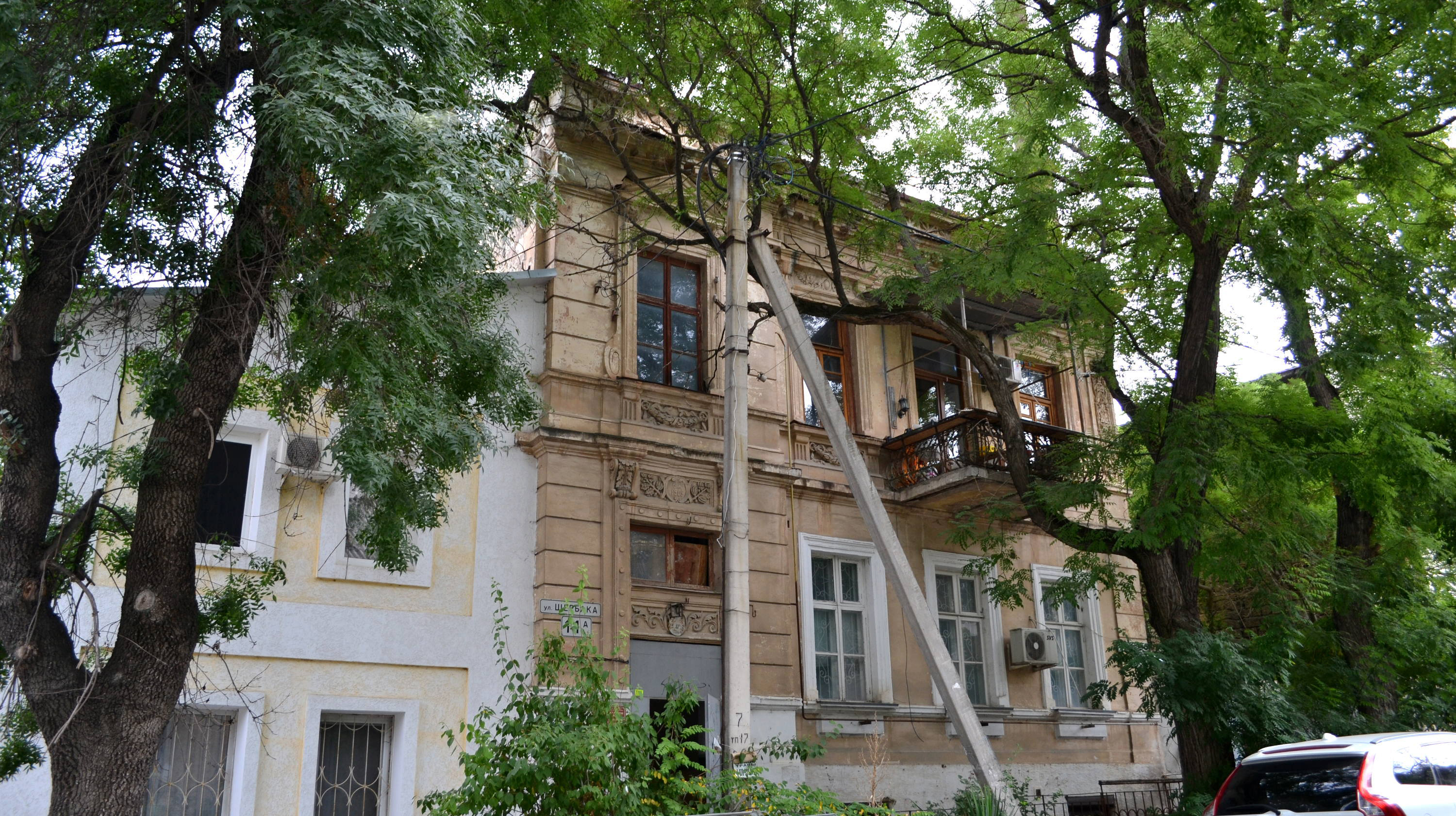 Один из самых архитектурно приметных домов находится по улице Сенявина, 3. На фасаде две даты: 1910 – постройки и 1963 – реконструкции. Улица в начале прошлого века представляла собой площадь и называлась Базарной. Сейчас на месте площади – сквер и деревья мешают сфотографировать здание в полную величину. Фасад украшен лепными гирляндами, венками, сводчатыми окнами и ажурными балкончиками. На нем табличка, что здание является памятником архитектуры Украины. А вот при попытке найти в интернете сведения о доме – кто построил, что в нем располагалось – открываются сотни страниц об аренде-продаже недвижимости, сдаче гостевых номеров и т.п. SEO-оптимизация когда-нибудь напрочь убьет мировую паутину. Да вы сами знаете, как сейчас стало трудно что-либо найти в интернете, пробиваясь через ворох «мусорных» ссылок.