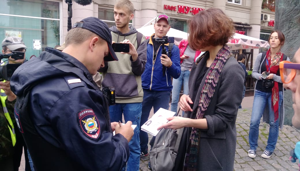 Полицейский переписывает паспортные данные пикетчицы, АрбатАня Гольдман / «Полит.ру»