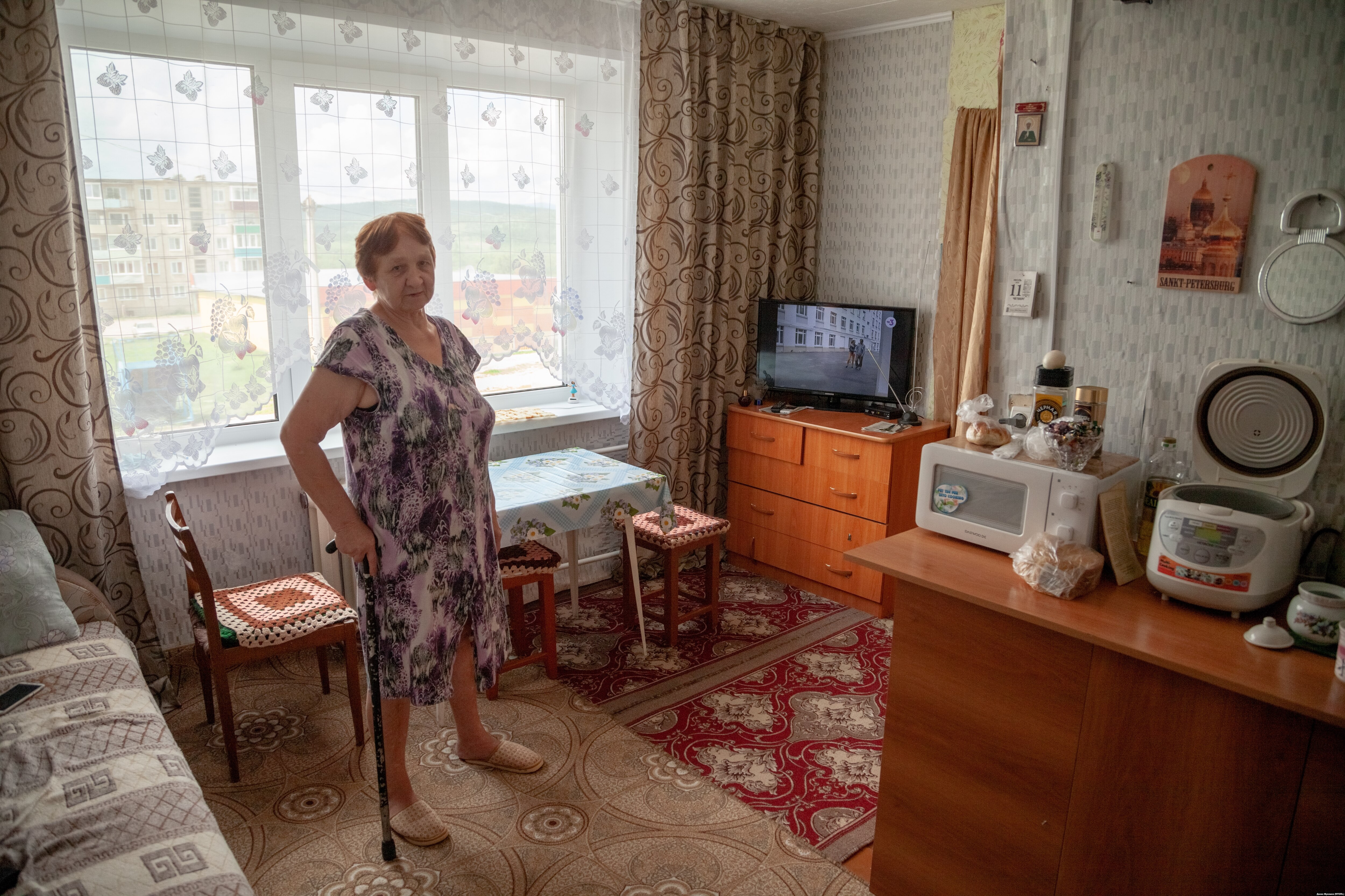 – Раньше тут дом хороший был, потом всех расселили, все разбежались, – рассказывает жительница дома Татьяна Егоровна. – Мэр сказал, что ремонта не будет. Крыша течет насквозь – в квартиры попадает. Зимой тоже холодно, потому что верх пустой, промерзает. Но идти нам некуда. Куда мы с мамой, пенсионеры, пойдем? Дети у меня в Абакане, но я к ним не поеду – в доме одна хозяйка должна быть.