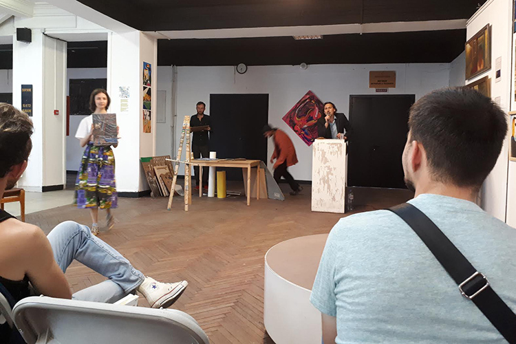 Мы сидим на третьем этаже кластера «Дом культуры», этажом ниже среди крошечных баров, кофеен, шавермочных шумит разухабистый психоделический концерт. Найти аукцион было непросто: в центральном крыле старого ДК разместились «Православная выставка и ярмарка монастырских продуктов». Некоторые гости аукциона, включая меня, по ошибке сначала заходят сюда, вежливо отказываются от предложенного травяного чая. Я посматриваю на иконы и спрашиваю, где здесь аукцион современного искусства. Продавцы, потягивая травяной чай, качают головами. Когда мы наконец находим тот самый третий этаж, оказывается, что аукцион пройдет в коридоре ДК, где под ногами — распухшие и местами выбитые клавиши паркета, а на стенах — рельефы во славу, очевидно, рабочих Кировского завода, что неподалеку. Начало торгов задерживается минут на сорок.