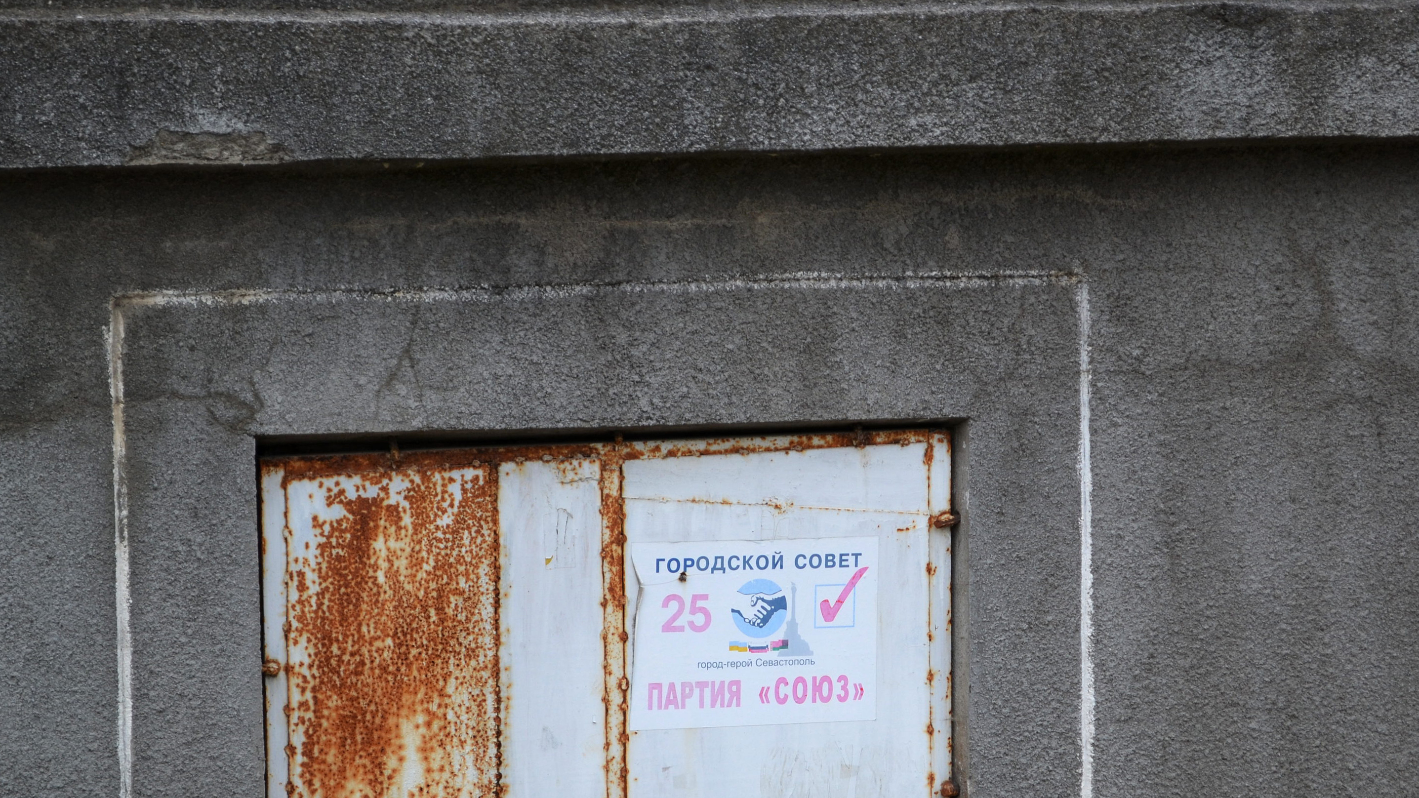 Снова возвращаюсь на площадь и на ржавой двери неработающего магазина случайно замечаю выцветшую, но еще читаемую листовку от партии «Союз» с выборов в горсовет 2010 года. Флаги Украины, России и Беларуси. Это партия известного крымского богача и политика, украинского нардепа трех созывов Льва Миримского, кто не помнит. Миримского уж с нами нет, партия не понятно, жива или мертва, а плакатик все висит.