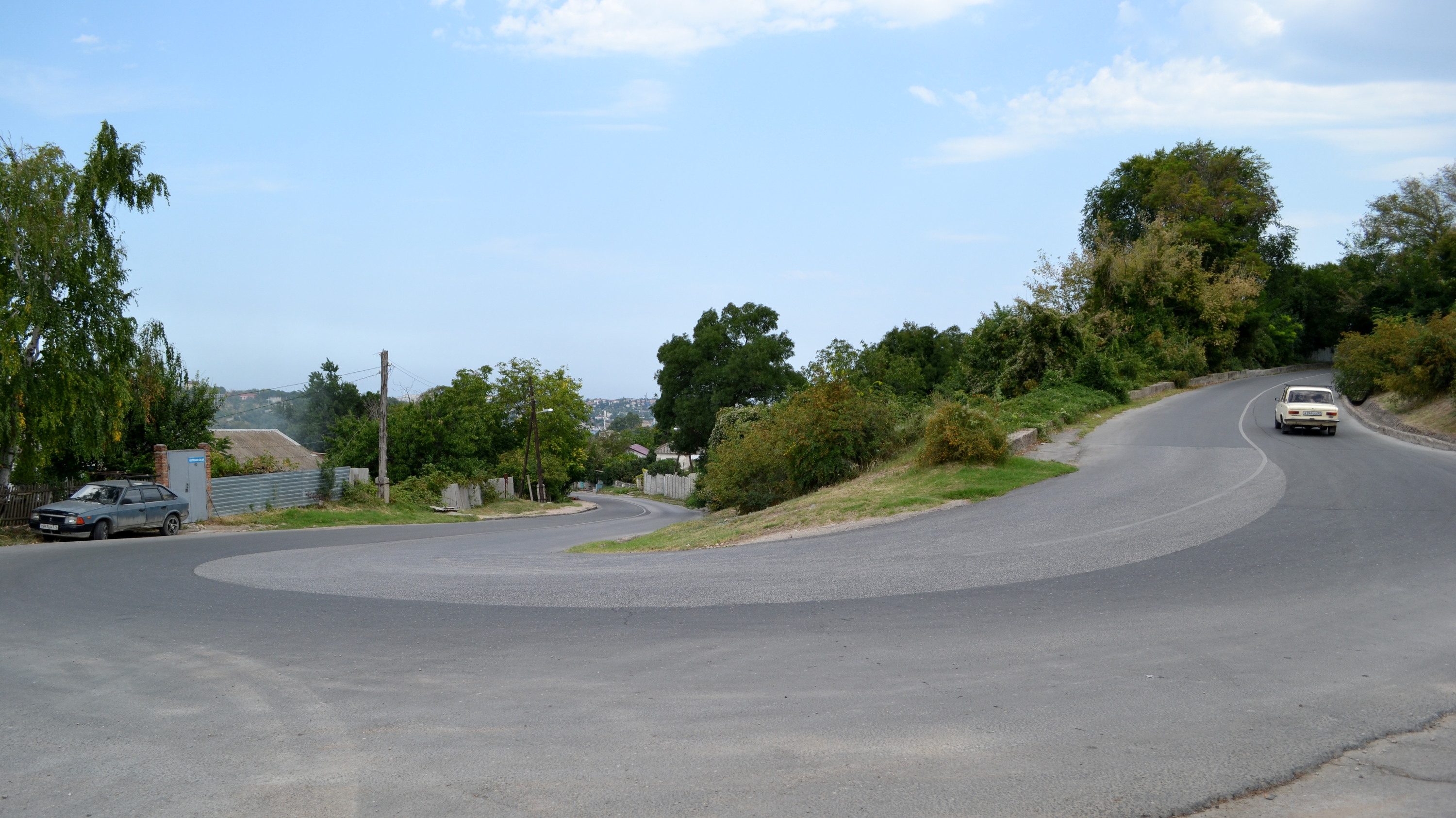Отправляюсь посмотреть, как там люди живут. Дорога петляет мимо 13-го судоремонтного завода Черноморского флота, потом – по улице Абрикосовой. У не местных водителей от тутошних крутых поворотов, подъемов и спусков обычно случается легкий шок. Некоторые повороты на серпантине градусов эдак в триста да еще и на подъеме. Вот, например, поворот с улицы Абрикосовой на улицу Гранатную.