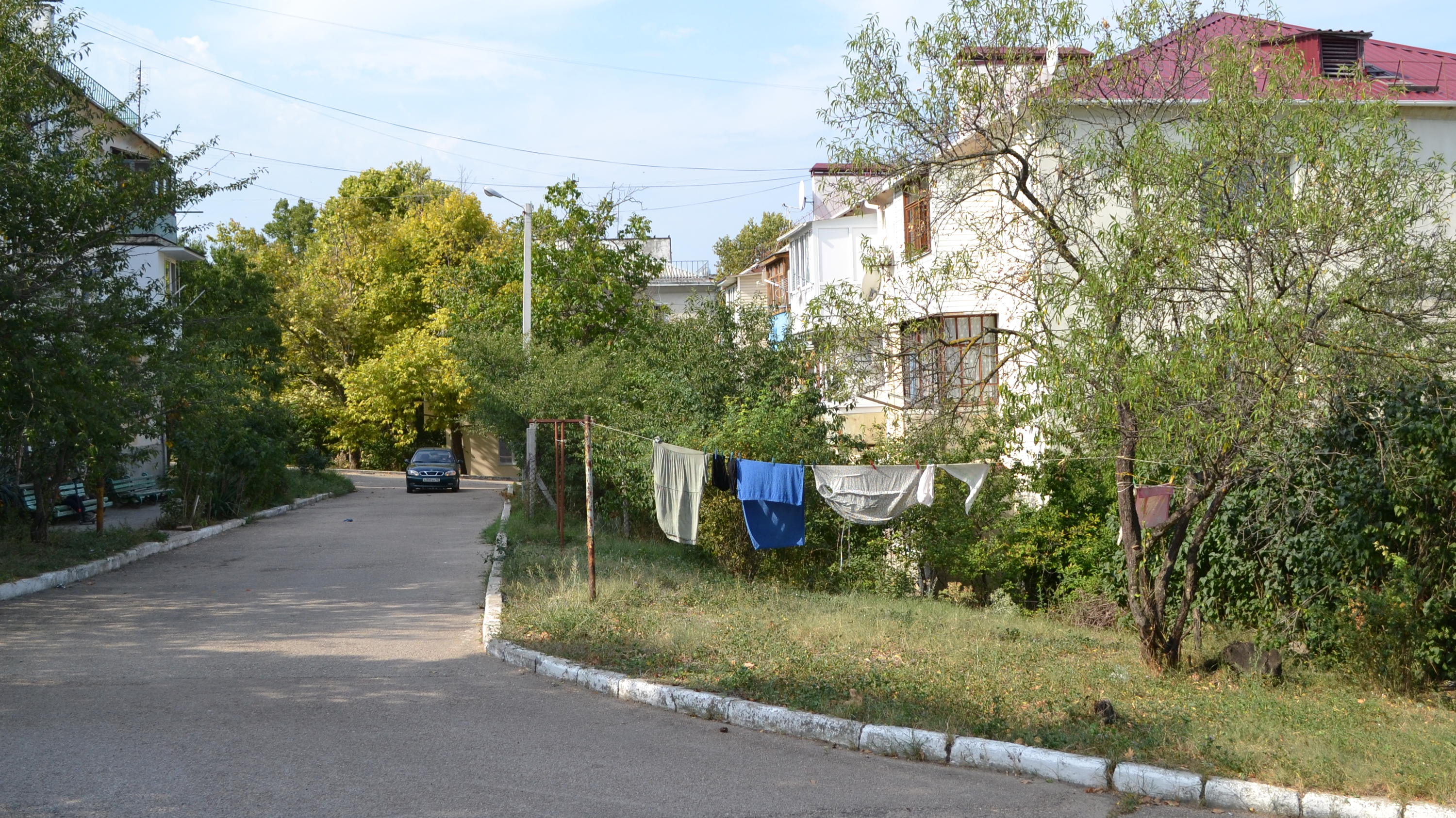 Микрорайон Жидилова – это пара десятков брежневских пятиэтажек, но есть и несколько более старых трехэтажных домов. Их старина ощущается по специфическому быту. Это и белье на веревках на газоне, разнотипные балконы и уютные лавочки под арками из винограда и плюща. На человека с фотоаппаратом здесь косятся, поскольку непривычно. Туристов в этом районе не бывает. Один пенсионер даже спросил меня: «Как разведка?». Хотел ответить ему на английском, но передумал. Шпиономания в Крыму сейчас зашкаливает, проблем потом не оберешься.