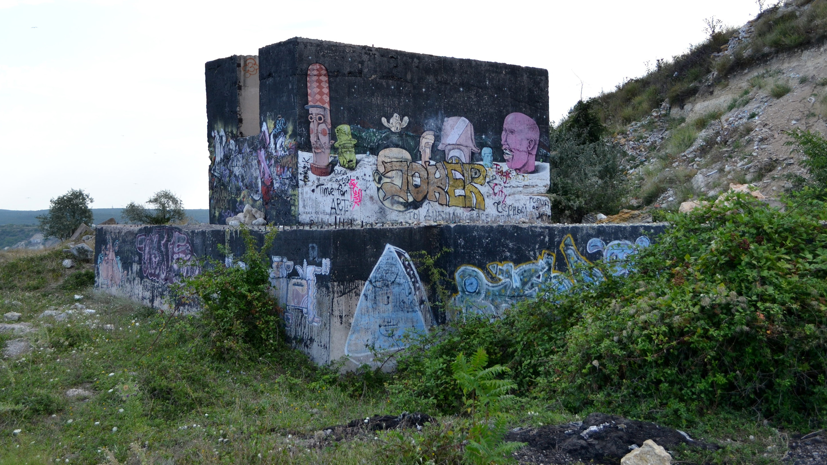 Еще один бетонный монстр расписной, за ним – вход в подземелье, ведущий под гору. Станция, которую начали строить в 30-е годы прошлого века, должна была обеспечивать весь Севастополь электроэнергией, работая на угле. Для защиты от разрушения во время войны, к которой усиленно готовился Советский Союз, решено было разместить ТЭС под землей. В недостроенном сооружении во время Второй мировой располагались оборонные предприятия. В 1950-х строительство возобновилось, но так и не было доведено до конца.