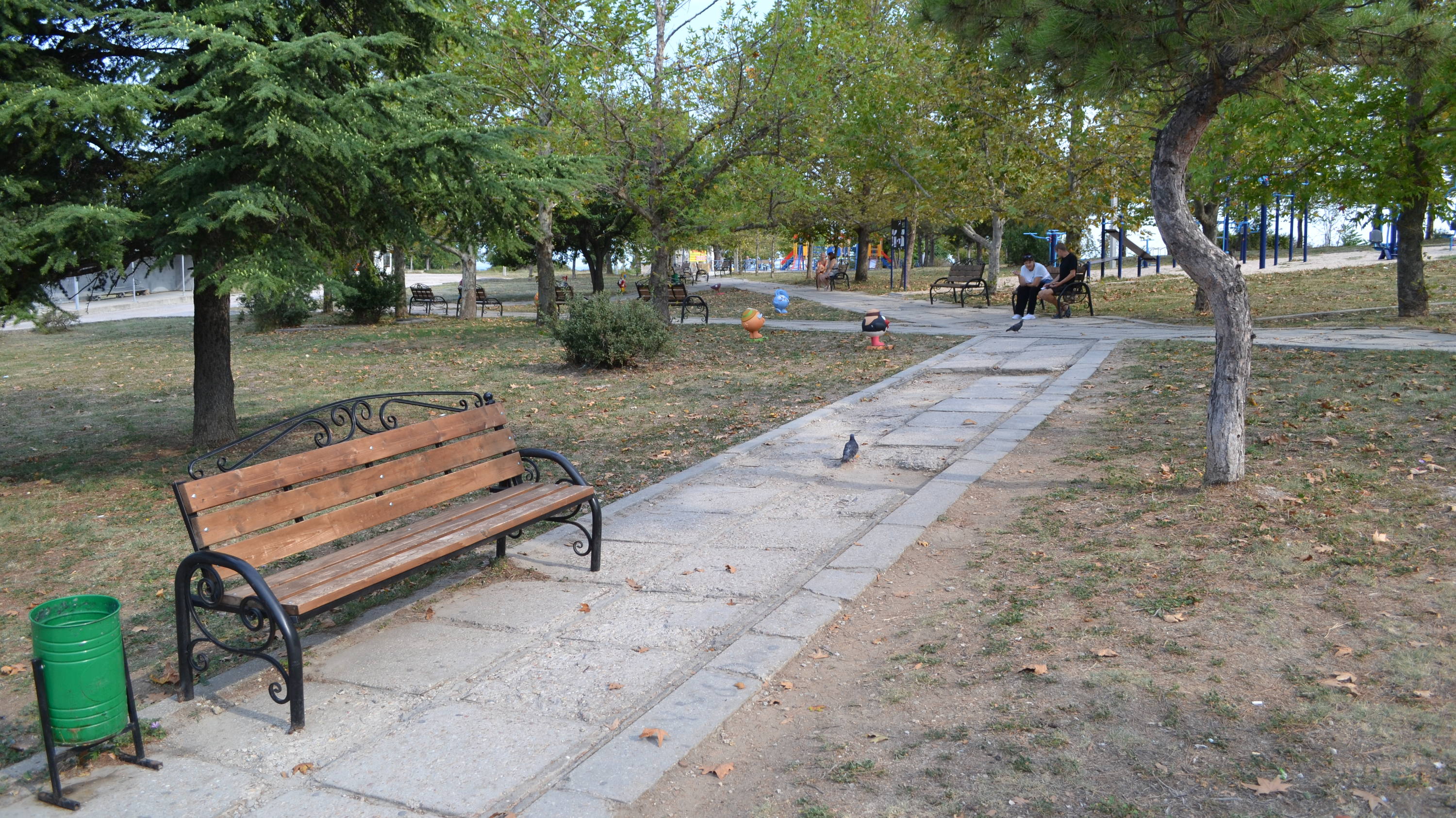 С другой стороны площади – небольшой сквер, за которым разместились детская и тренажерная площадки. Лавочки сравнительно новые, дорожки сделаны еще при Союзе. Поливом травы никто не занимается, но деревья и кустарники растут, тень обеспечивают. Днем здесь малолюдно, но вечером, как мне сказали, «многие гуляют».