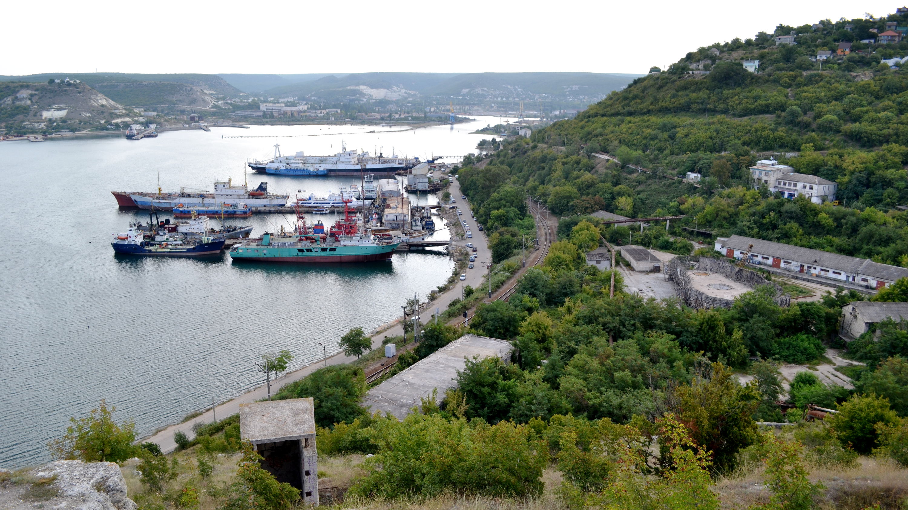 А это Георгиевская балка, напротив которой видны причалы № 58 и 59. В дальней части бухты виден Инкерман. Георгиевская балка получила свое название по стоявшей когда-то здесь церкви. Также здесь проходит ведущая в Севастополь железная дорога. От этого места и до железнодорожного вокзала она еще дважды нырнет в тоннели – Троицкий и Графский.