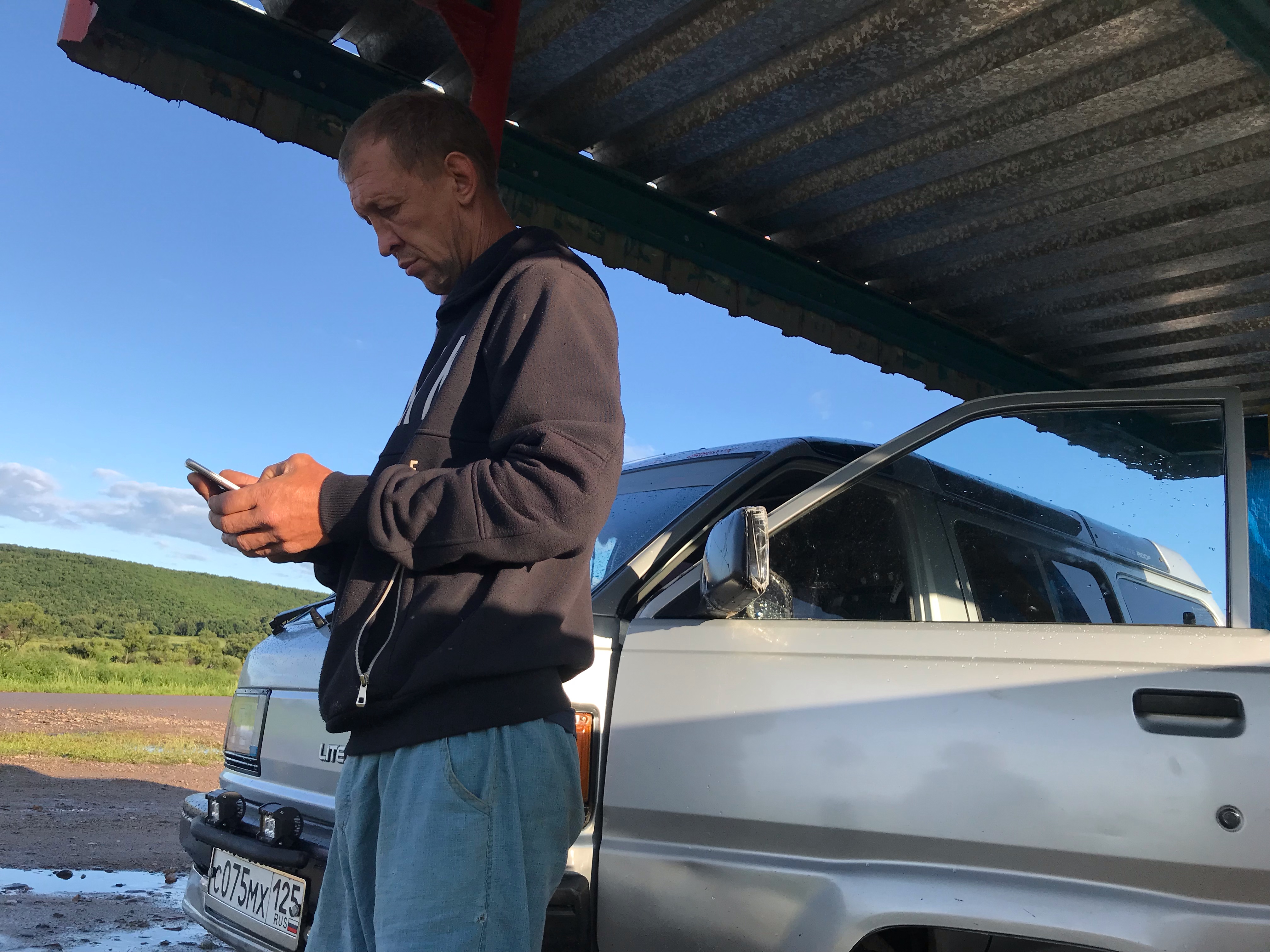 Уезжая из села, видим автобусную остановку. С одной стороны от нее натянут синий тент, хорошо знакомый каждому любителю пляжного отдыха в Приморье как лучшая защита от дождя, солнца и ветра. Рядом припаркован старенький японский микроавтобус. Вокруг по лужам бегают дети. Оказывается, здесь, на автобусной остановке, семья из четырех человек живет уже два дня.