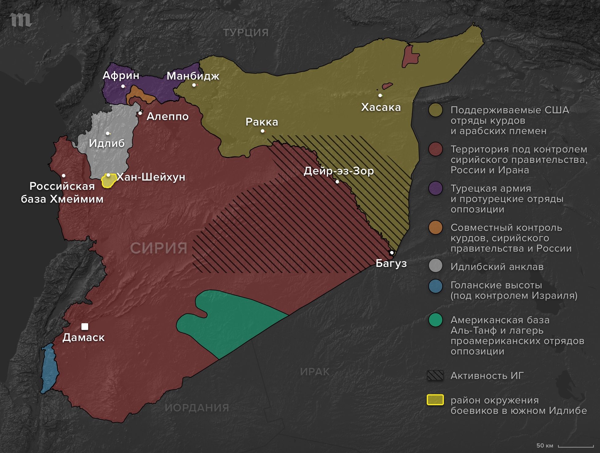 21-22 августа 2019 года сирийская армия при активной поддержке авиации и спецназа России завершила окружение исламистов, связанных с движением «Аль-Каеда», в южной части провинции Идлиб. Эта провинция остается последним прибежищем оппозиции режиму президента Башара Асада, которая не зависит от других стран. Самая крупная за последний год победа сирийской армии задела интересы сразу трех государств, вовлеченных в конфликт: России, США и Турции. «Медуза» объясняет, что случилось — и как эти страны будут делить Сирию.